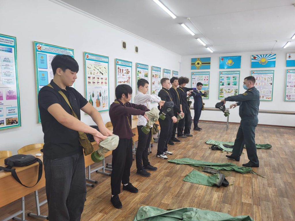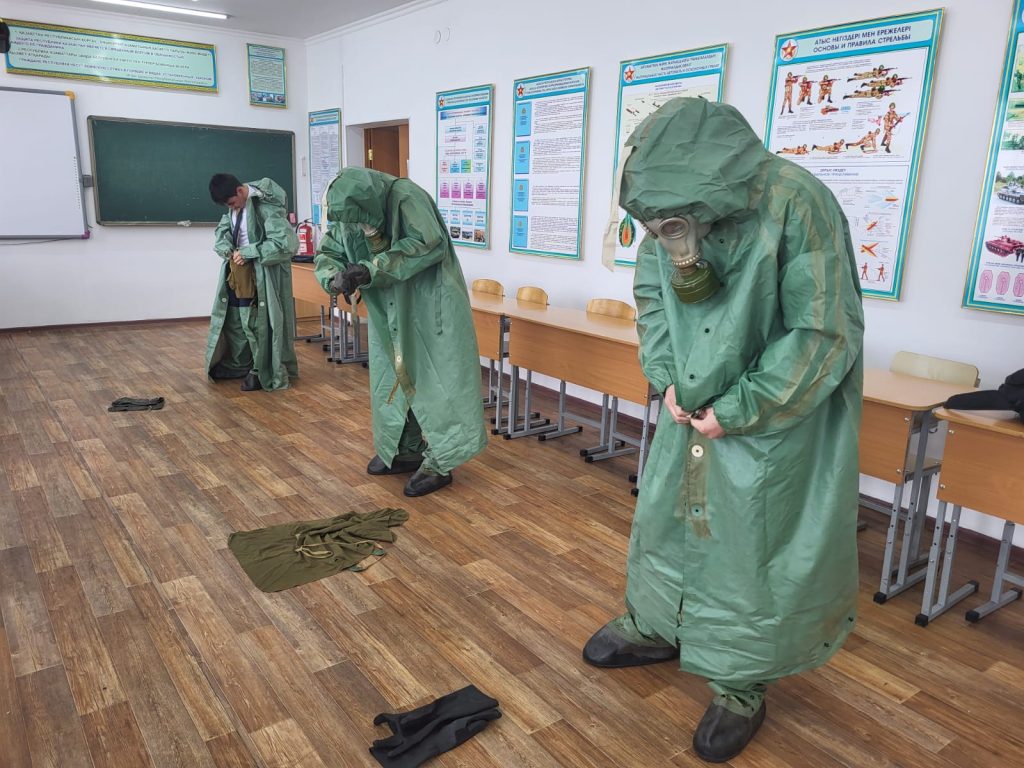 Білім алушылар АҚ сигналдары бойынша нормативтерді орындады, тыныс алу органдарын жеке қорғау құралдарын (ТОЖҚҚ), теріні қорғау құралдарын (ТҚҚ) киді.