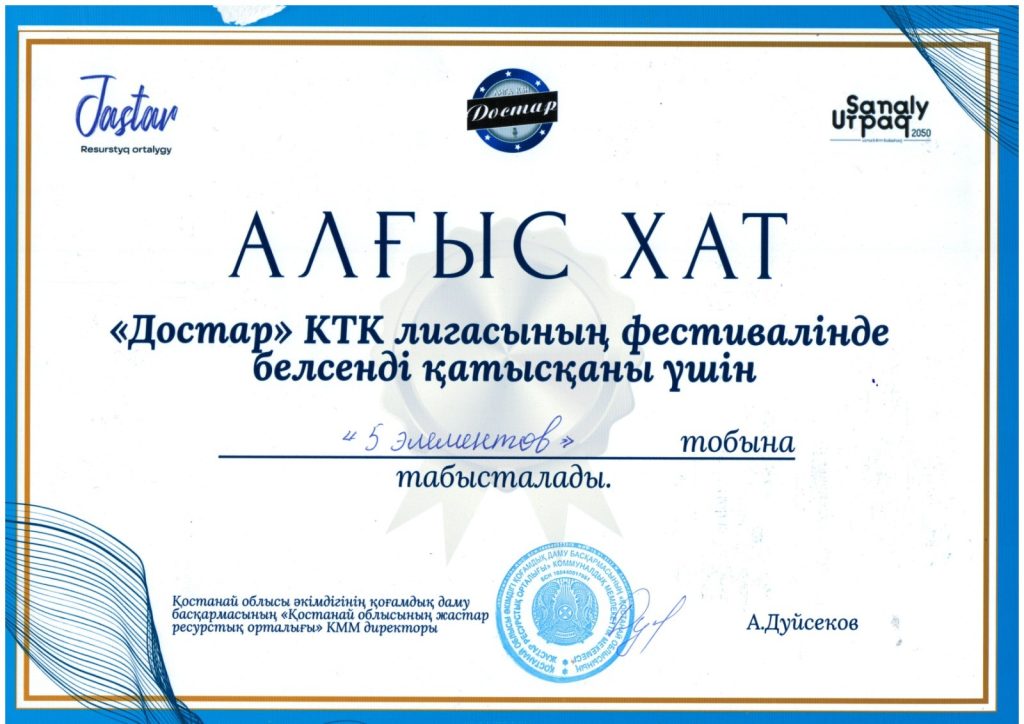 2025 жылдың 30 қыркүйегінде Қостанай қаласында талантты және шығармашыл жастарды біріктірген «Достар» КВН лигасының фестивалі өтті. Аталған шараға Қостанай политехникалық жоғары колледжінің «5 Элемент» атты командасы қатысып, колледж намысын қорғады.