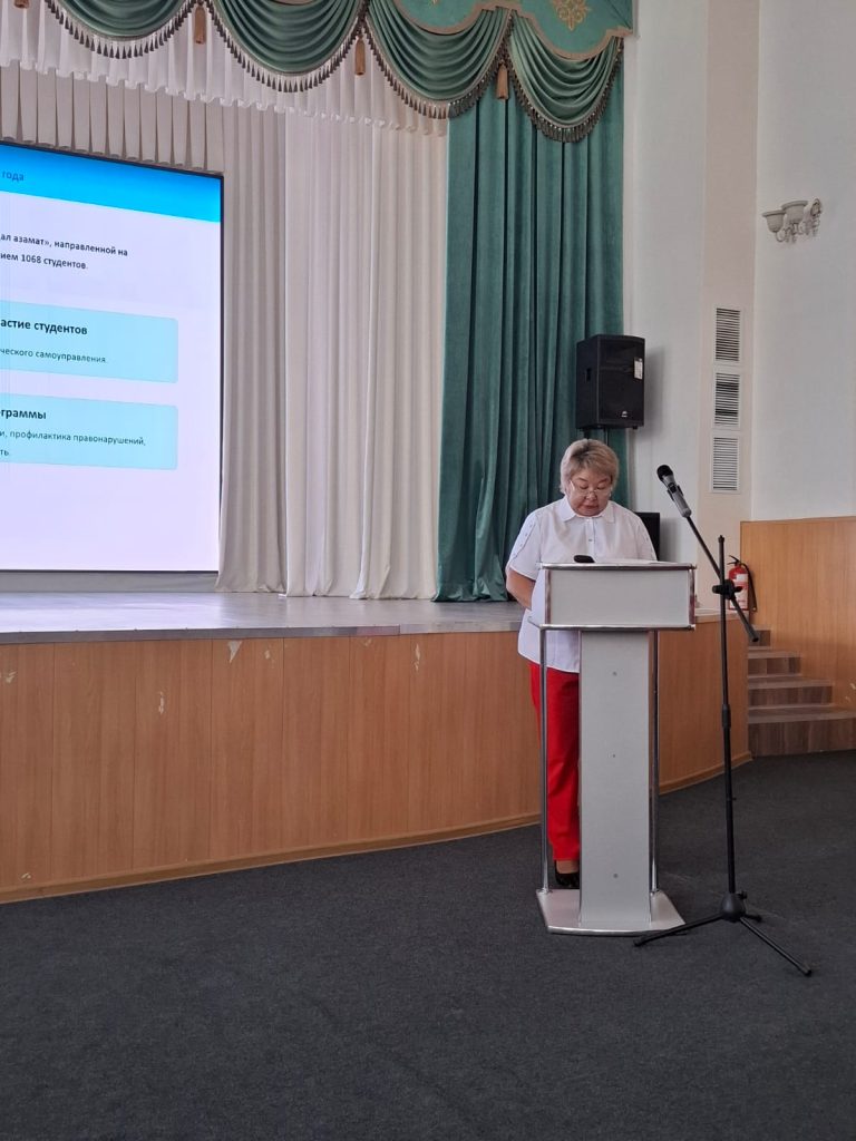 Заместитель директора по УВР Дюсекеева Л.К. выступила на Педагогическом совете с вопросом на тему «Реализация Единой программы воспитания «Адал азамат” в колледже». Главной целью мероприятия стало обсуждение форм и методов формирования у обучающихся высоких моральных качеств, гражданской ответственности, а также воспитания антикоррупционного мировоззрения.