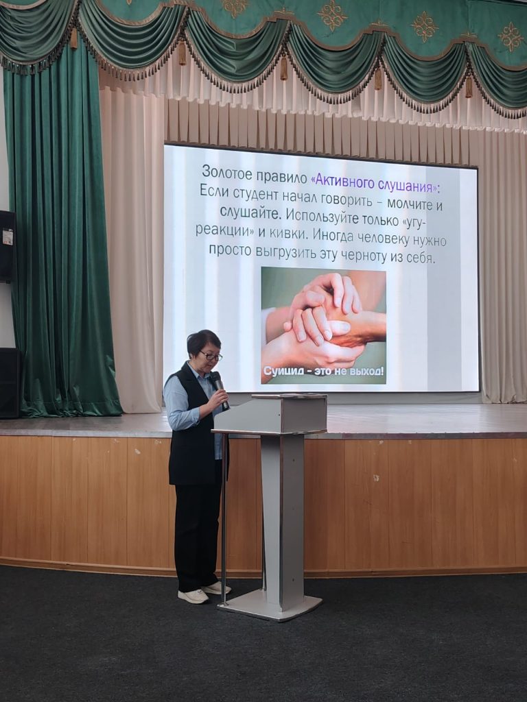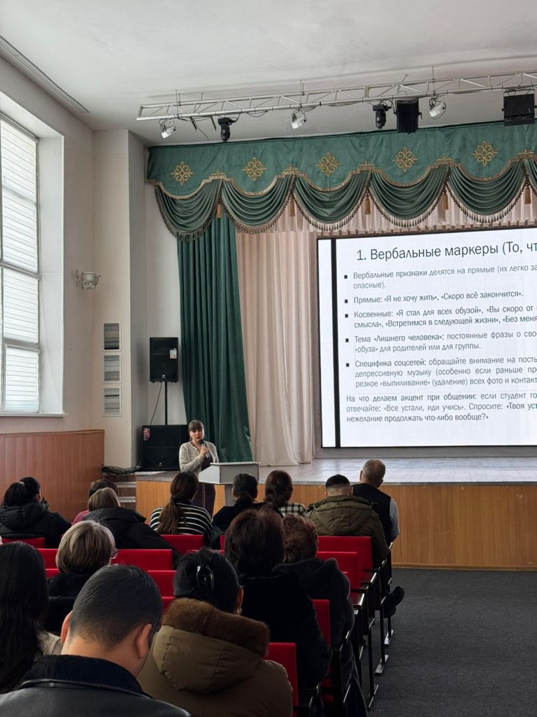 • Педагог-психолог Науменко Т.В. суицидтік қауіп белгілерін ерте анықтау туралы баяндама жасады. Вербалдық маркерлер (тікелей және жанама қатерлер), вербалдық емес сигналдар (мимика, «гигиеналық регресс») және «қоштасу сыйлығы» синдромы сияқты мінез-құлық индикаторлары егжей-тегжейлі талданды.
