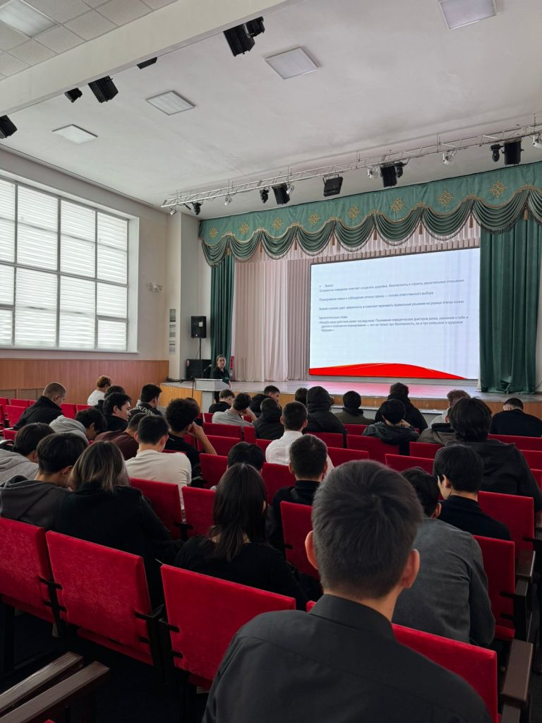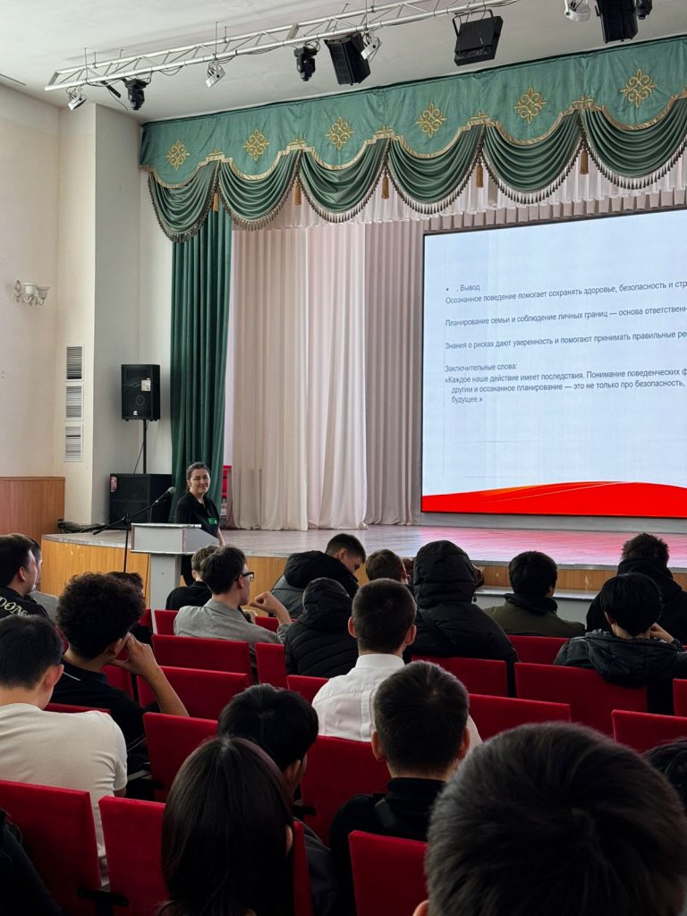 Дәрісті акушер Гадиева Луиза Исаевна жүргізді. Іс-шара барысында репродуктивті денсаулыққа әсер ететін негізгі мінез-құлықтық қауіп факторлары, отбасын жоспарлауға жауапкершілікпен қараудың маңыздылығы, сондай-ақ психоэмоционалдық шамадан тыс жүктеме мен күйзелістің алдын алу жолдары қарастырылды.
