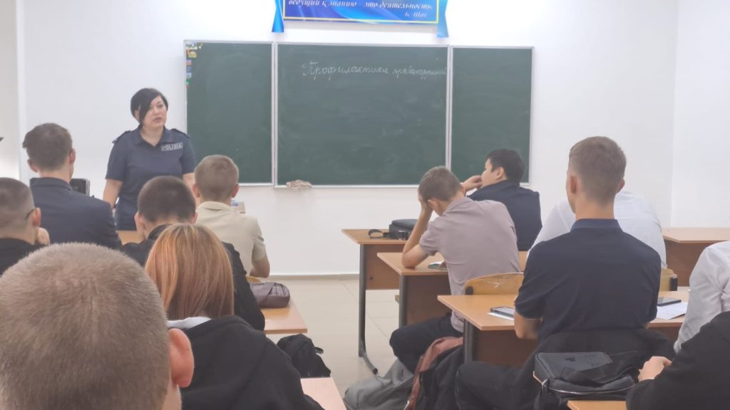 Іс-шараға кәмелетке толмағандар ісі жөніндегі аға инспектор Р.Б. Кендирбаева қатысты. Ол студенттердің әртүрлі құқық бұзушылықтар үшін әкімшілік және қылмыстық жауапкершілігі туралы толық айтып берді. Әңгіме барысында мынадай маңызды тақырыптар қозғалды: