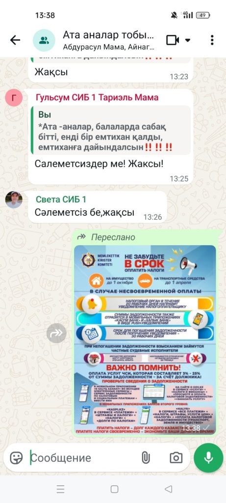 Ақпарат жалпы білім беретін мектептер мен колледждердің ата-аналар чаттарына жіберілді. Бұл ата-аналардың кең ауқымын қамтуға және материалдармен қашықтан ыңғайлы түрде танысуға мүмкіндік берді. Инфографикада салықтардың мемлекеттің әлеуметтік-экономикалық дамуындағы маңызы, салық төлеушілердің міндеттері, салық заңнамасын бұзғаны үшін жауапкершілік, сондай-ақ заңға бағынатын азаматтарды тәрбиелеуде ата-аналардың жеке үлгісінің маңыздылығы көрсетілді.