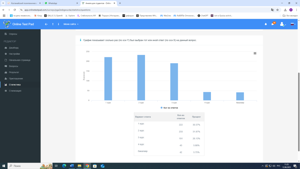 В анкетировании приняли участие 731 респондентов, студенты 1-4 курса, из них 1 курс – 31% (222 человек), 2 курс – 32% (233 человек), 3 курс – 27 % ( 191 человек), 4 курс- 6%(43 человек).