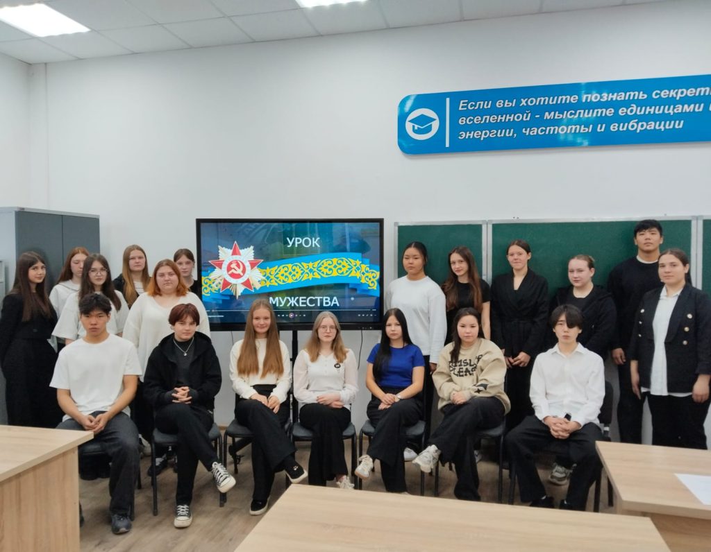 Урок мужества был проведён для студентов групп СТ-9 и ЭС-25. Участникам были представлены видеоматериалы о выдающихся лётчиках-казахстанцах – Талгате Бегельдинове, Леониде Беде и Иване Павлове, каждый из которых совершил более 200 боевых вылетов.
